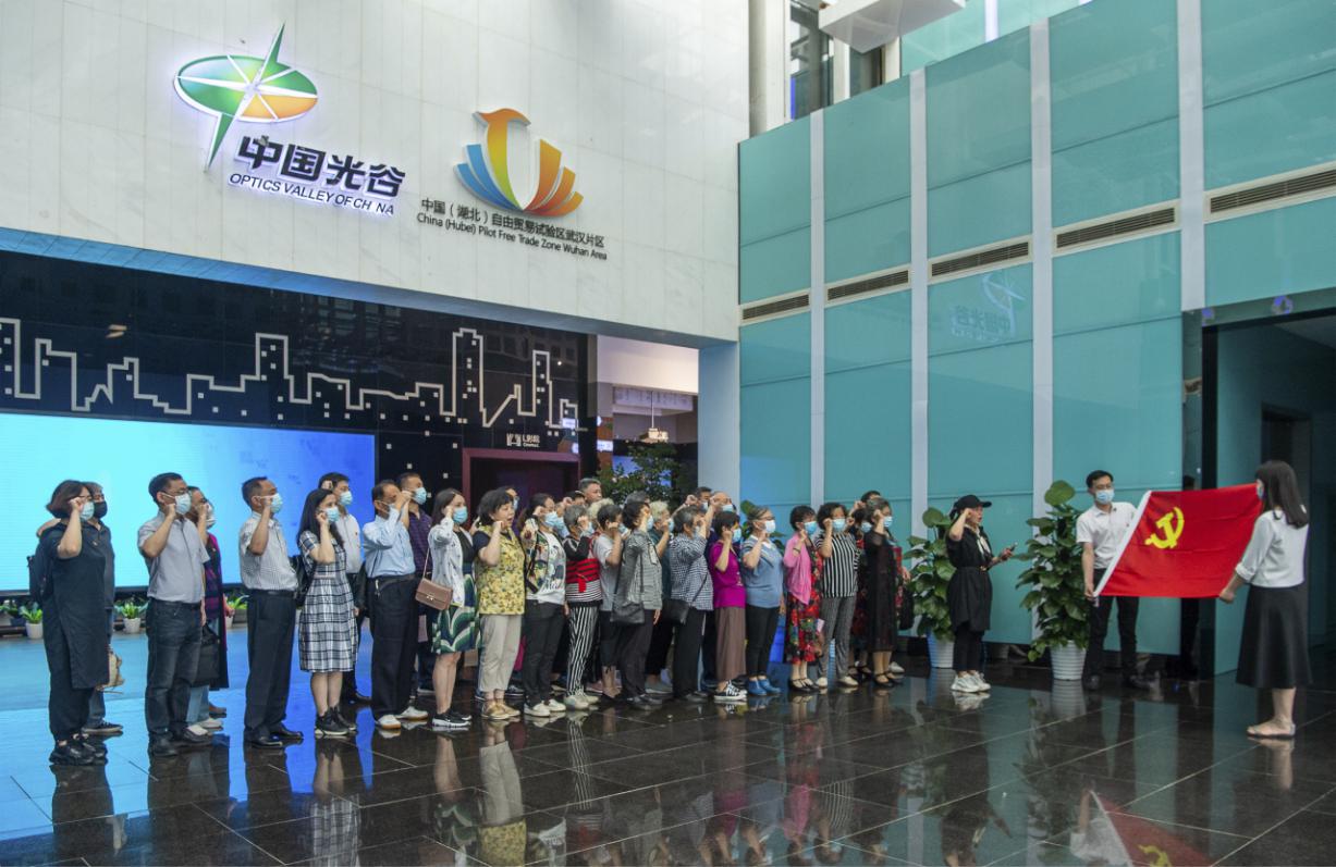 到达展示中心后,在庄严的党旗下,党员干部们高举右手齐声宣誓,重温入党誓词,随后,观看了以“智汇东湖、创新之路”为主题的武汉光谷宣传片,裸眼3D宣传片给视觉带来的震撼效果让党员代表们不禁夸口称赞。