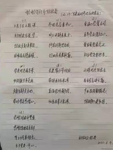 福往者福来,爱出者爱返。活动结束后,自力社区党员自发作诗一首,悄悄送给财政局党支部,用饱含真情的诗歌回馈了此次共建活动的难忘情谊。