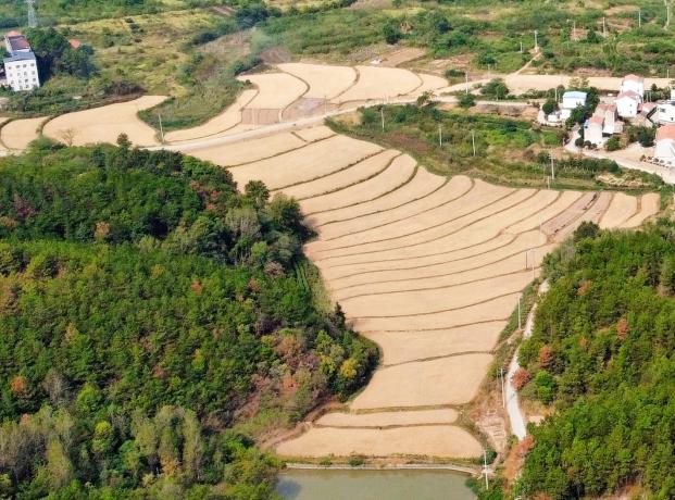 图一 收割后的稻田俯瞰 图二 泊带禾合作社晾晒稻谷