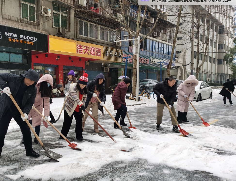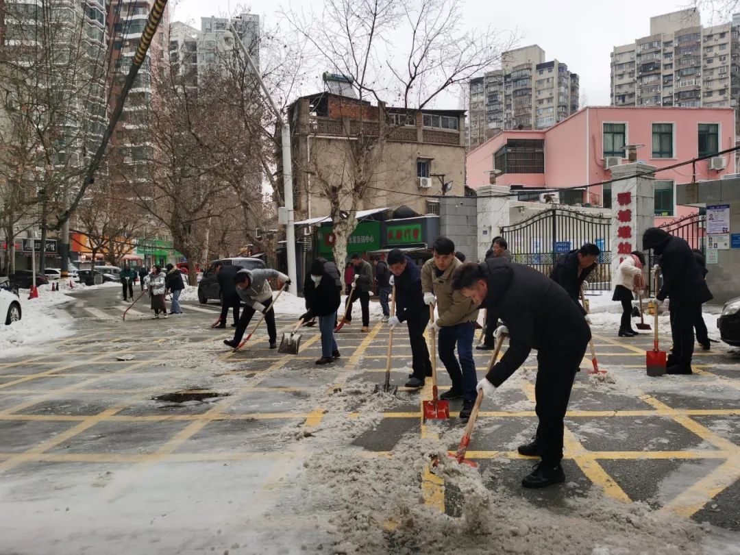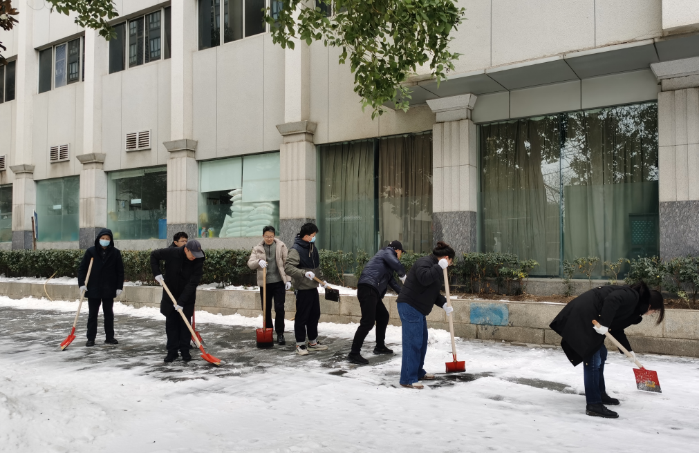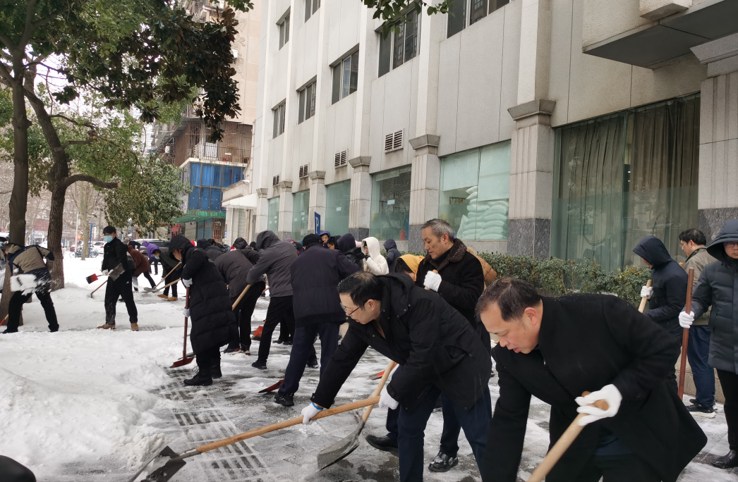 各位干部职工拿着铁锹、扫帚认真清理积雪