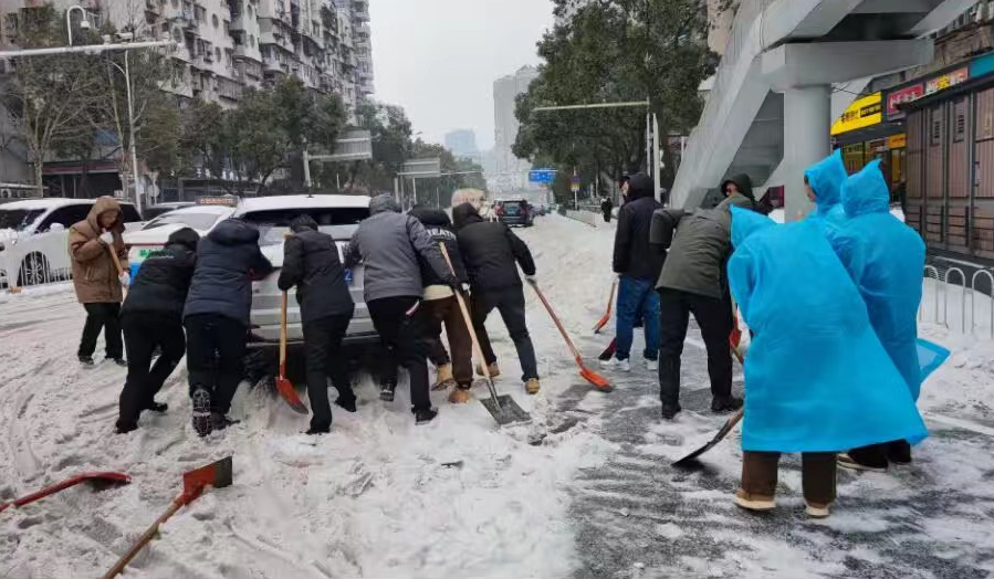 为防止夜间道路结凝难行,武汉市财政局干部职工接续奋战,下午开展第二次铲雪活动。