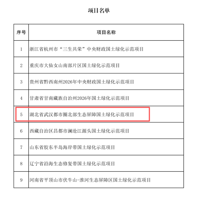 近日,我市联合孝感市申报的“武汉都市圈北部生态屏障国土绿化示范项目”经过激烈角逐,在全国众多候选项目中脱颖而出,成功入选2026年中央财政国土绿化试点示范项目。该项目总投资8.45亿元,其中武汉片区项目总投资约4.35亿元。项目的成功入选,不仅标志着我市助推长江经济带绿色高质量发展的实践获得国家权威认可,更是武汉践行“绿水青山就是金山银山”理念、深入开展“五争”行动的生动实践。