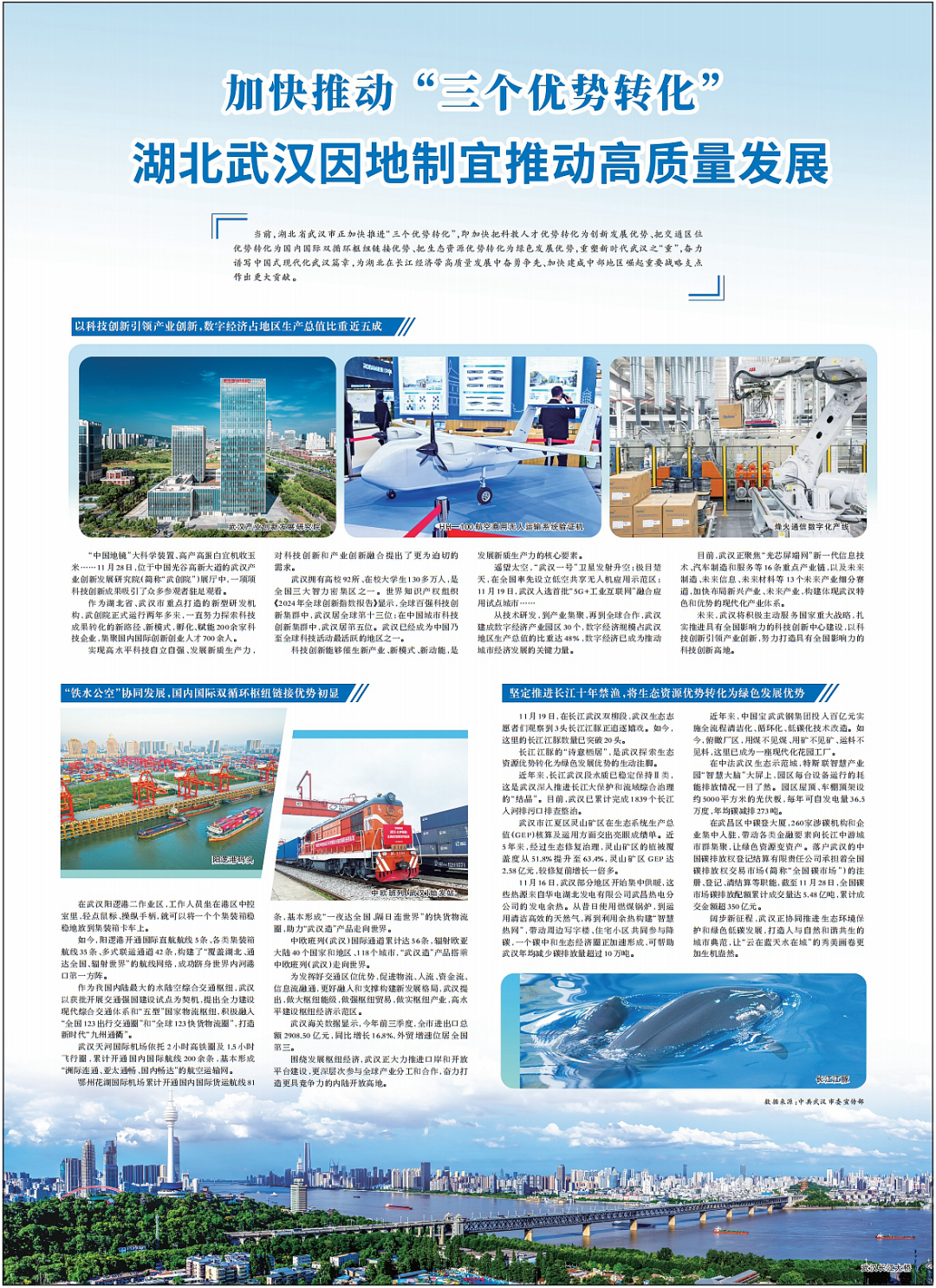 当前,湖北省武汉市正加快推进“三个优势转化”,即加快把科教人才优势转化为创新发展优势、把交通区位优势转化为国内国际双循环枢纽链接优势、把生态资源优势转化为绿色发展优势,重塑新时代武汉之“重”,奋力谱写中国式现代化武汉篇章,为湖北在长江经济带高质量发展中奋勇争先、加快建成中部地区崛起重要战略支点作出更大贡献。以科技创新引领产业创新