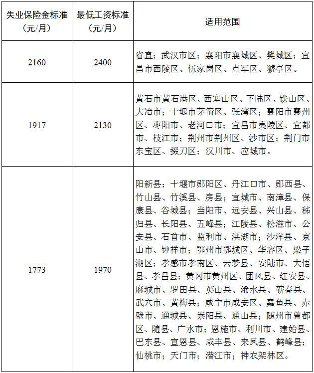 湖北省分区域失业保险金发放标准