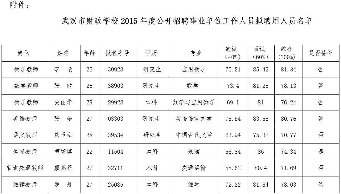 附件:武汉市财政学校2015年度公开招聘事业单位工作人员拟聘人员名单