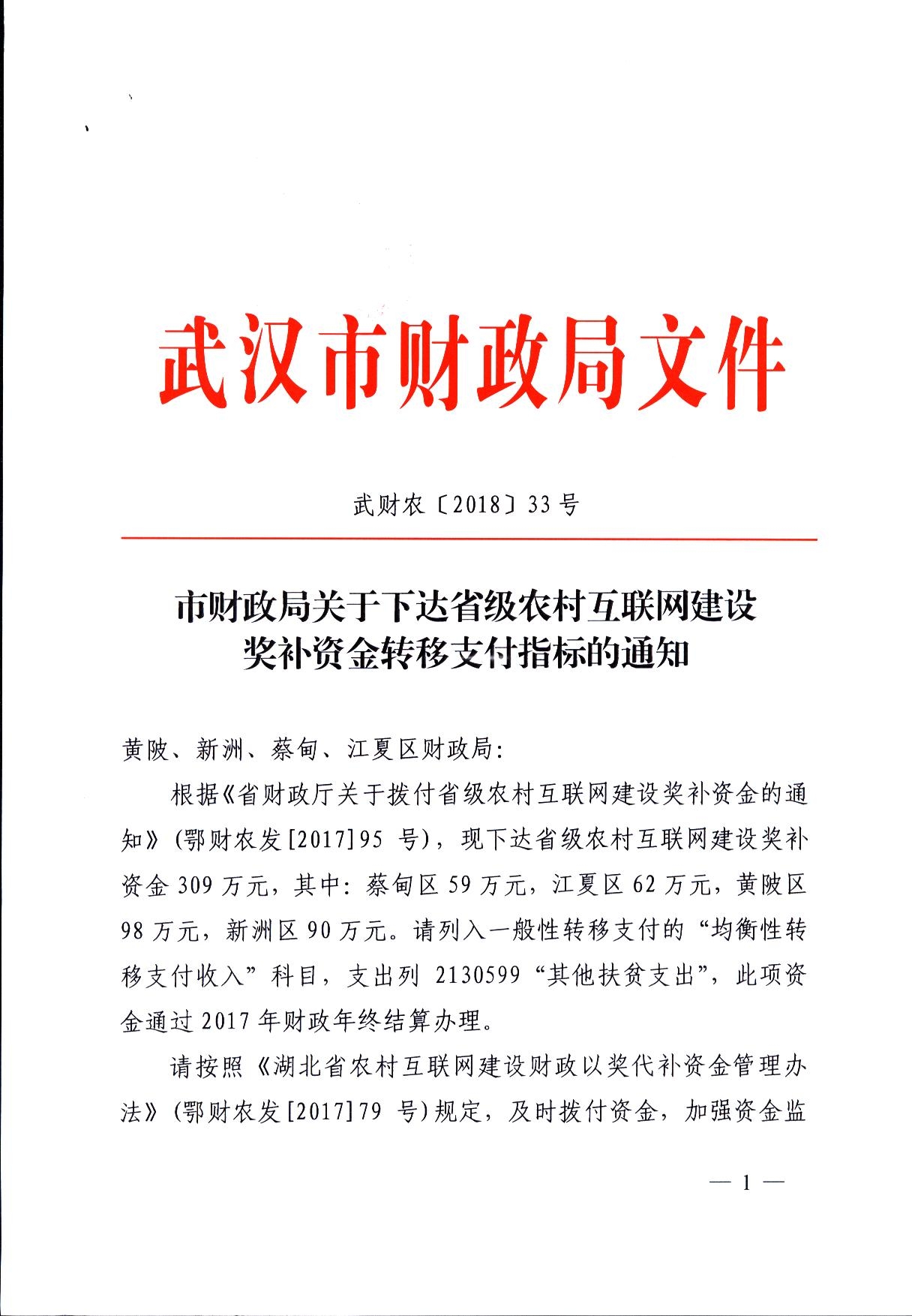 市财政局关于下达省级农村互联网奖补资金转移支付指标的通知