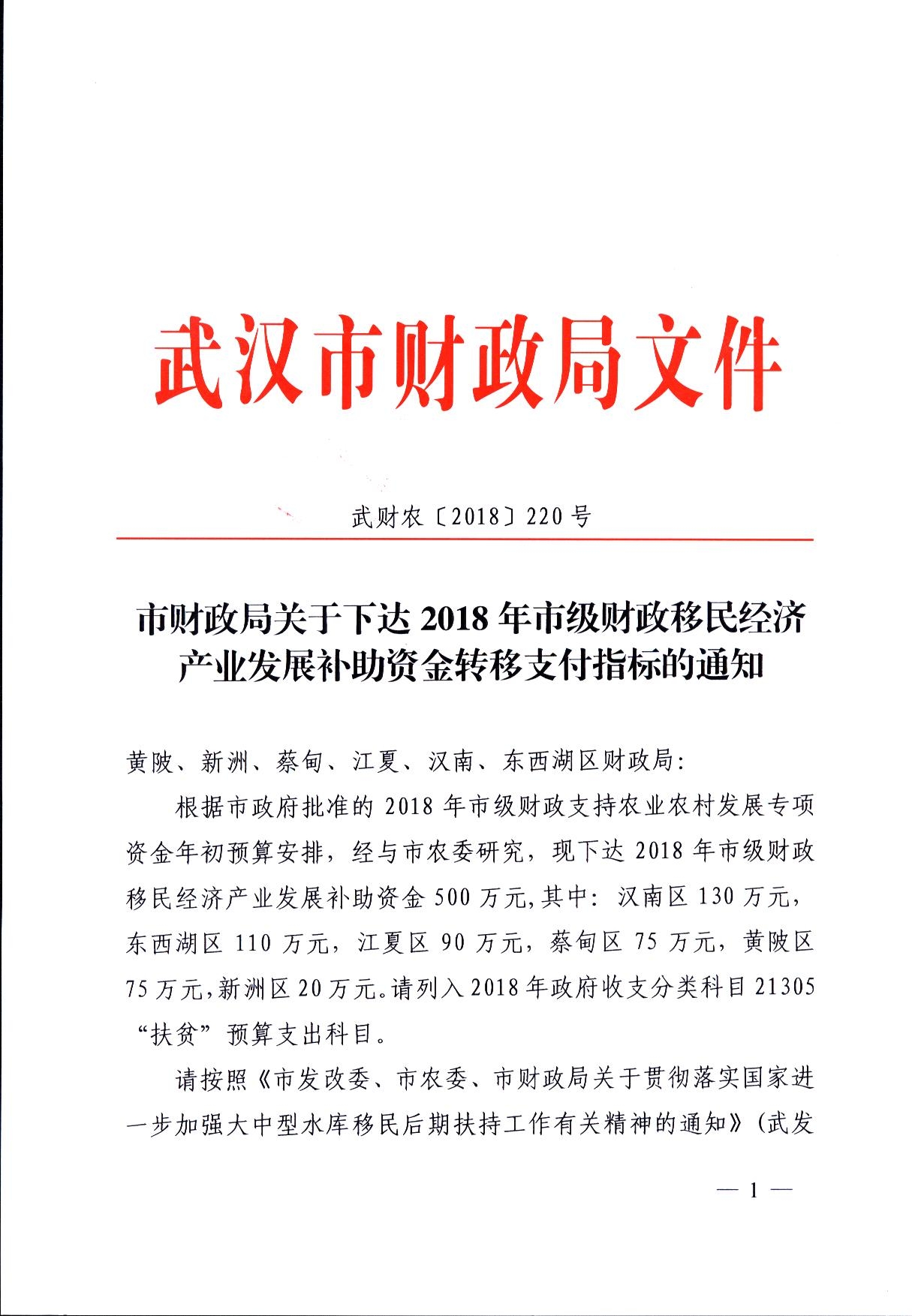 市财政局关于下达2018年市级财政移民经济产业发展补助资金转移支付指标的通知