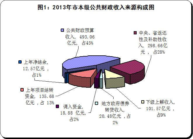 2013年市本级公共财政收入来源总计1080.9亿元,其中:(1)市本级地方公共财政预算收入493.06亿元;(2)中央、省返还性及补助性收入298.66亿元;(3)下级上解收入101.57亿元;(4)地方政府债券转贷收入20.48亿元;(5)调入资金18.88亿元;(6)上年项目结转资金135.68亿元;(7)上年净结余12.57亿元。