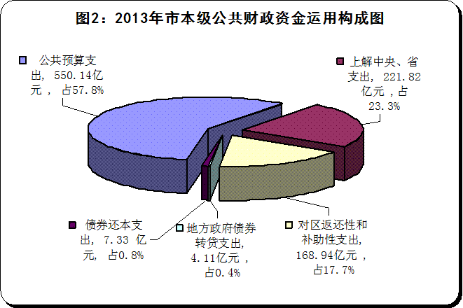 2013年市本级公共财政资金运用总计952.34亿元,其中:(1)市本级公共财政预算支出550.14亿元;(2)上解中央、省支出221.82亿元;(3)对区返还性和补助性支出168.94亿元;(4)地方政府债券转贷支出4.11亿元;(5)债券还本支出7.33亿元。