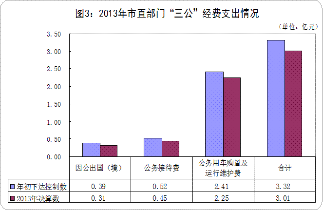 经汇总,2013年市直党政机关、全额拨款事业单位的“三公”经费财政拨款支出决算3.01亿元,为预算控制数的90.7%。其中:因公出国(境)费用0.31亿元,为预算控制数的79.5%;公务用车购置及运行维护费2.25亿元,为预算控制数的93.4%;公务接待费0.45亿元,为预算控制数的86.5%。
