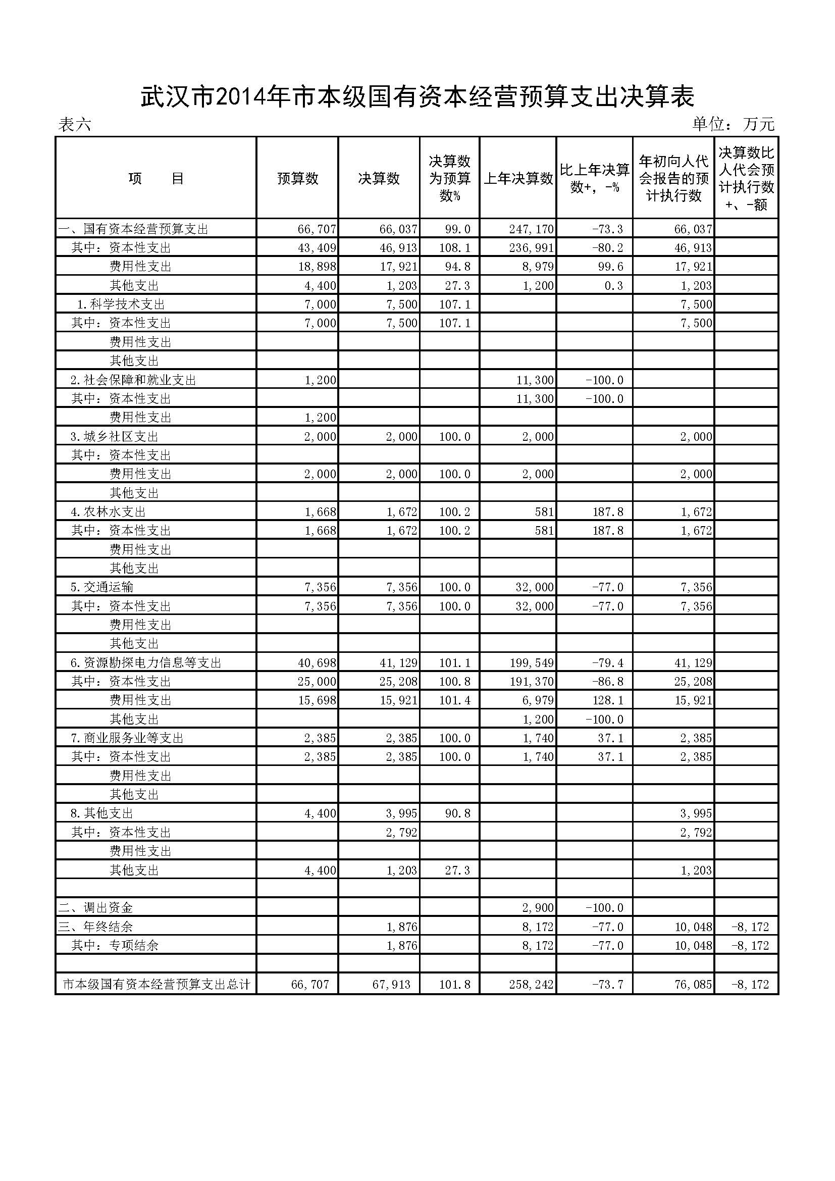 表6:武汉市2014年市本级国有资本经营预算支出决算表