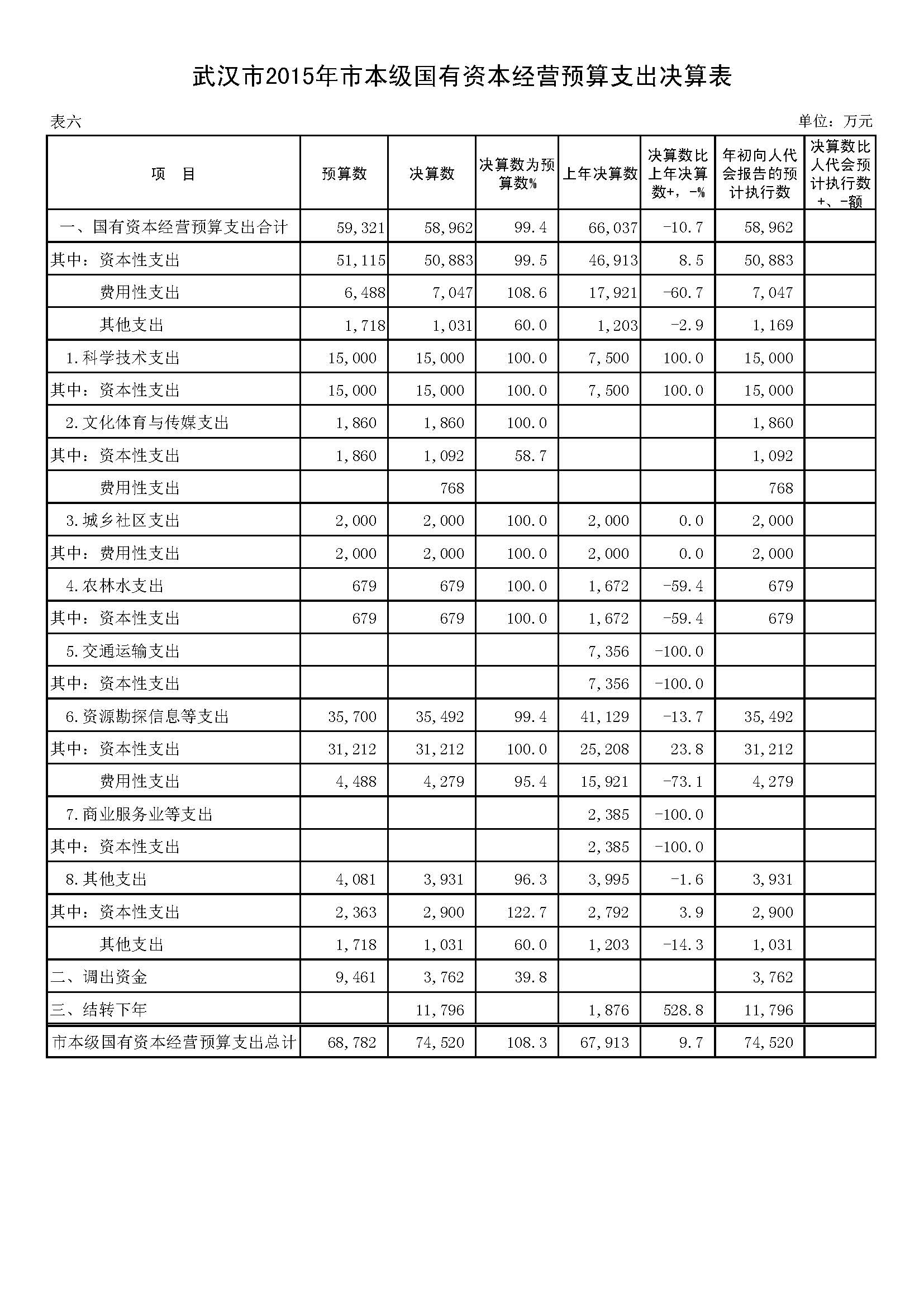 表6:武汉市2015年市本级国有资本经营预算支出决算表