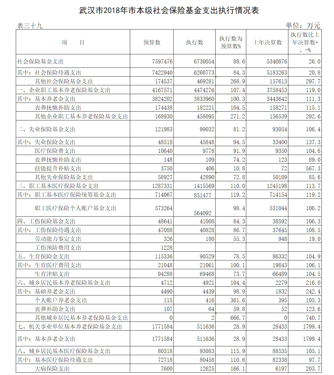 表39:武汉市2018年市本级社会保险基金支出执行情况表