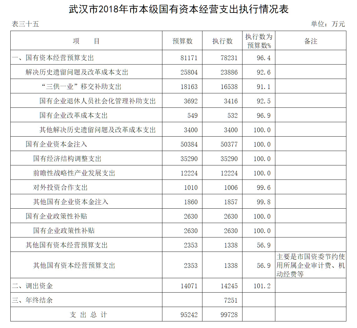 表35:武汉市2018年市本级国有资本经营支出执行情况表