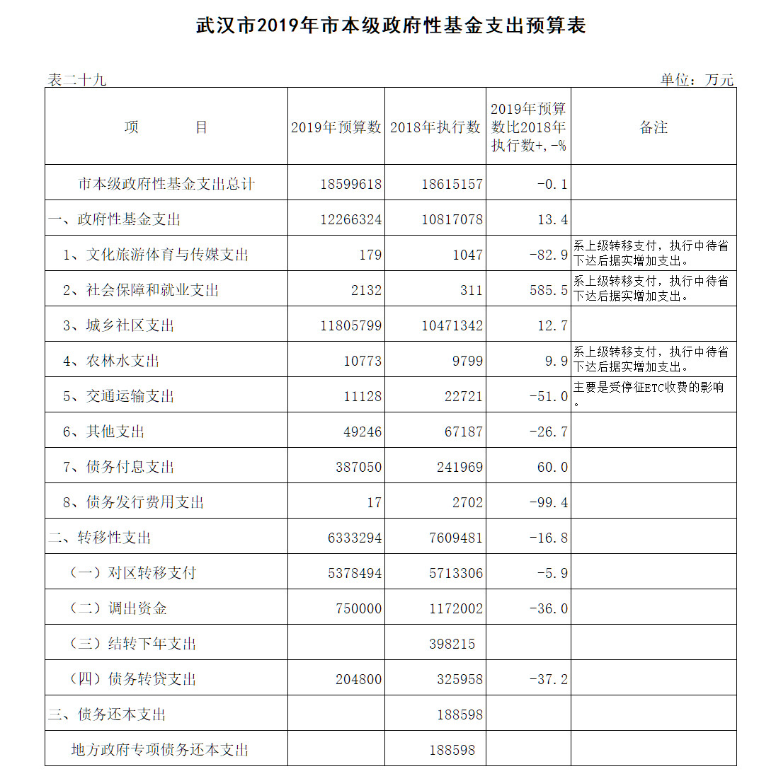 表29:武汉市2019年市本级政府性基金支出预算表