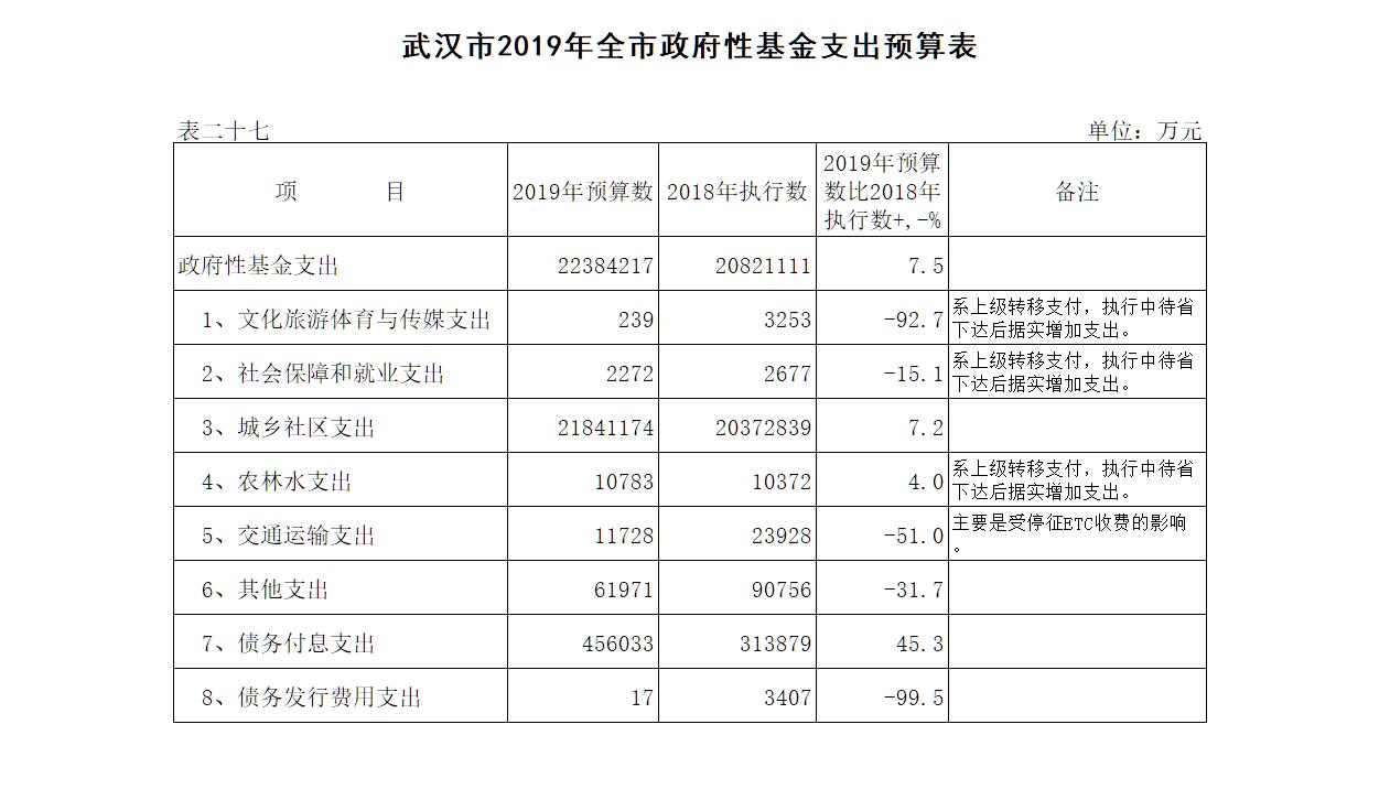 表27:武汉市2019年全市政府性基金支出预算表