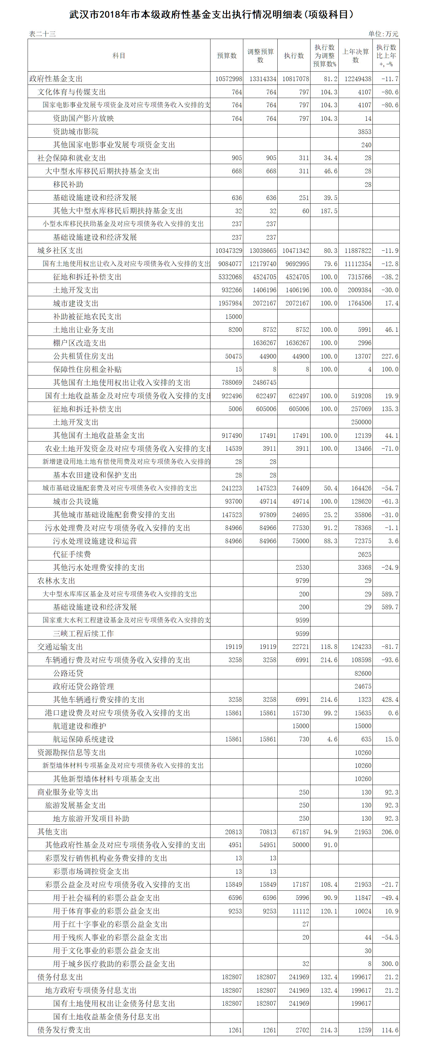 表23:武汉市2018年市本级政府性基金支出执行情况明细表(项级科目)