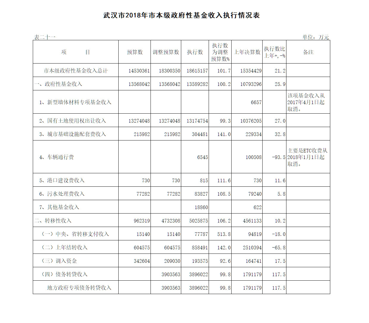 表21:武汉市2018年市本级政府性基金收入执行情况表