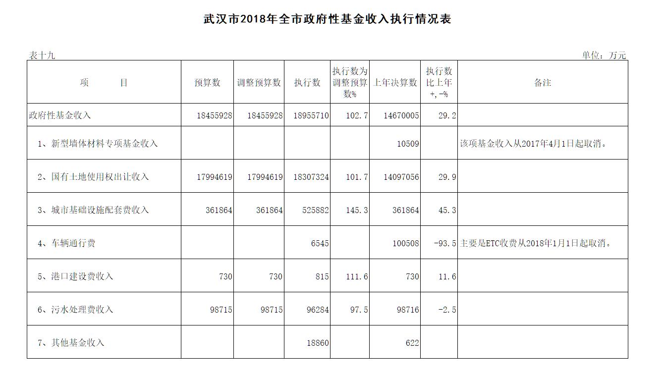表19:武汉市2018年全市政府性基金收入执行情况表