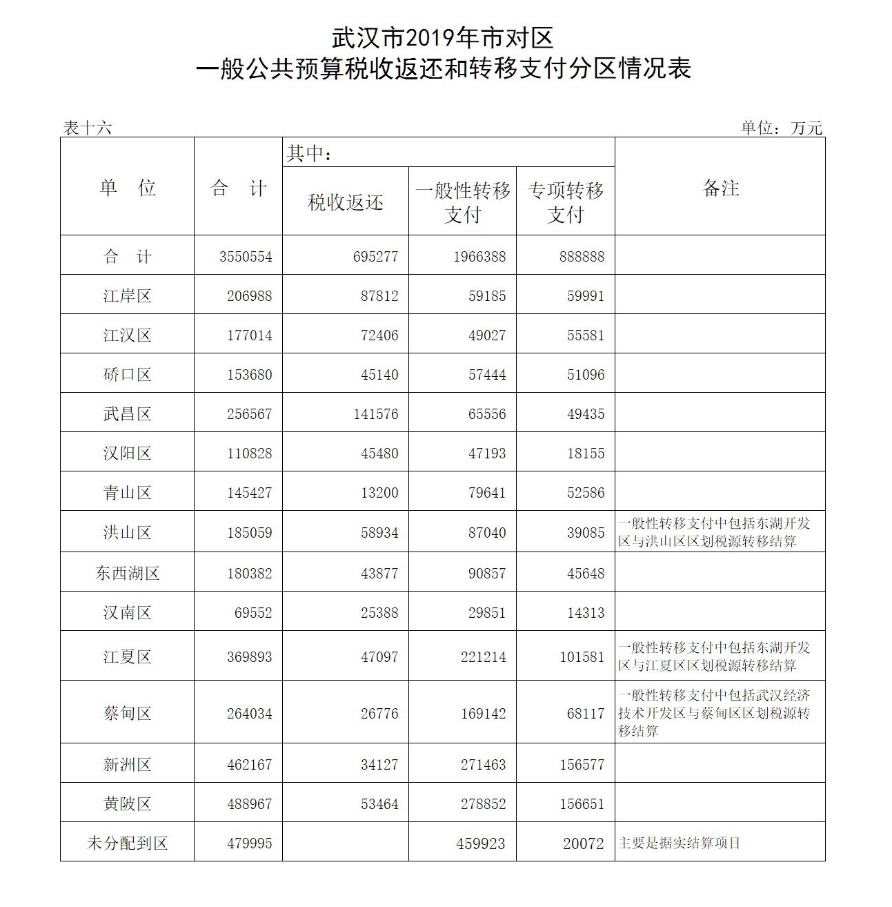 表16:武汉市2019年市对区一般公共预算税收返还和转移支付分区情况表