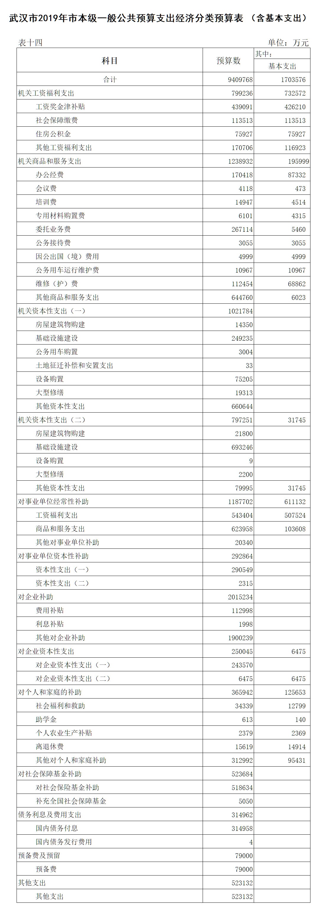 表14:武汉市2019年市本级一般公共预算支出经济分类预算表(含基本支出)