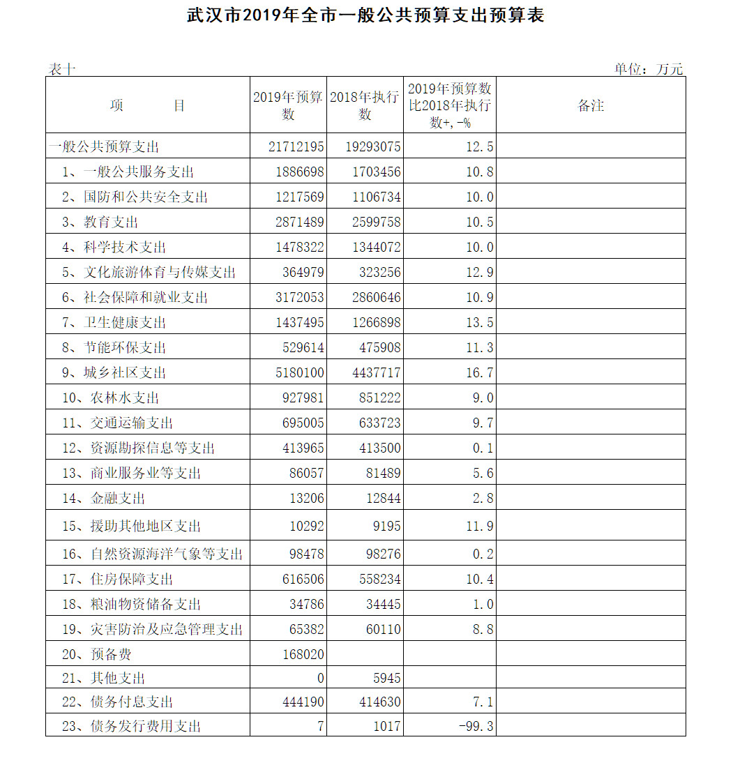 表10:武汉市2019年全市一般公共预算支出预算表