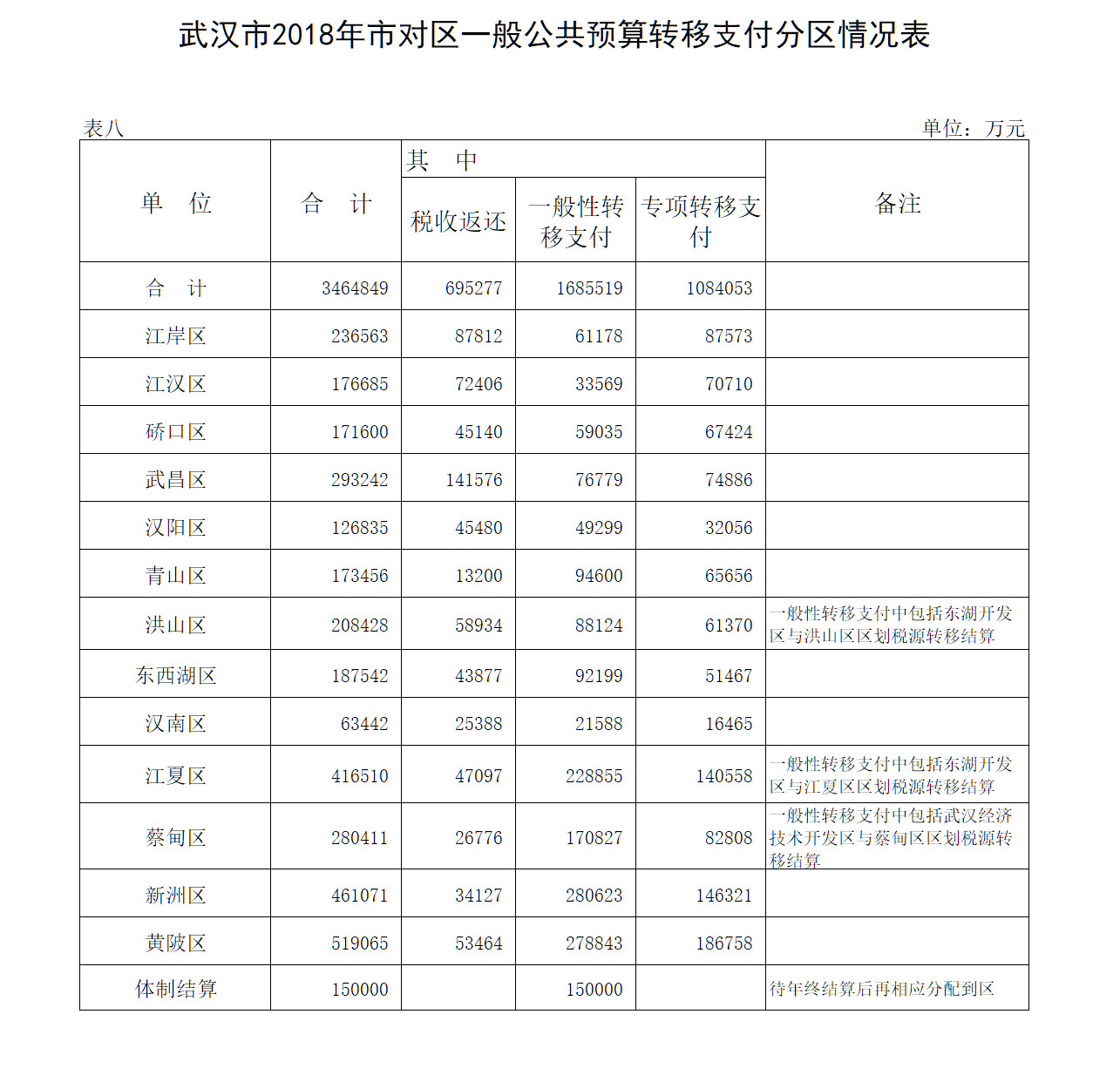 表8:武汉市2018年市对区一般公共预算转移支付分区情况表
