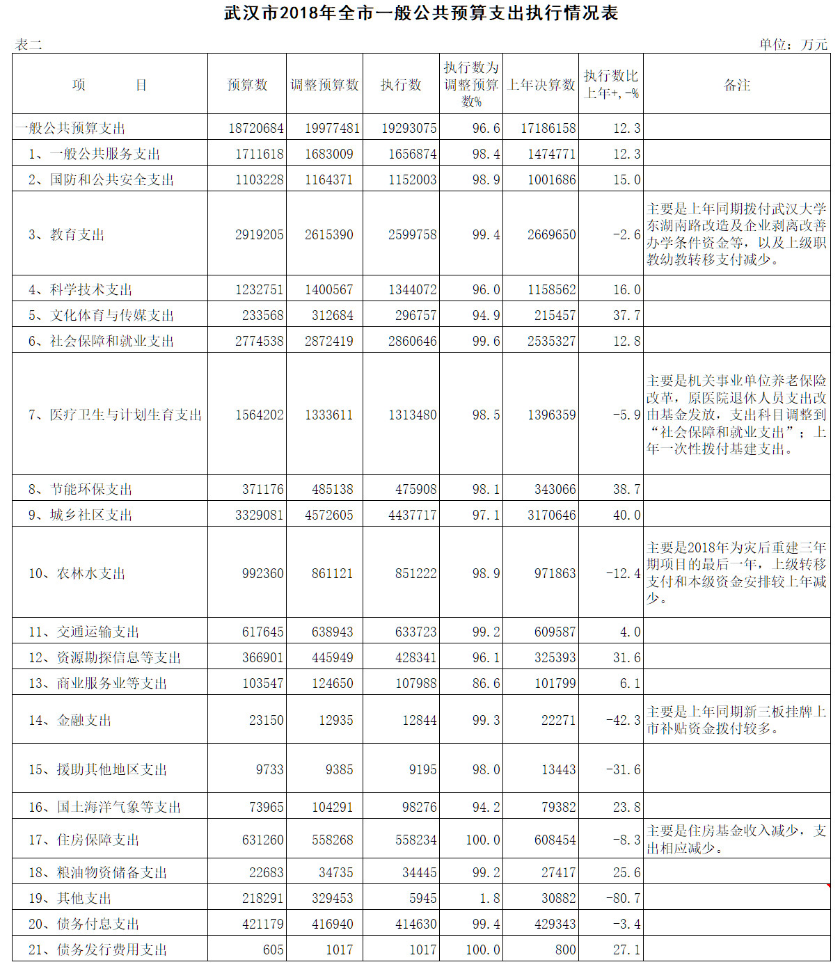 表2:武汉市2018年全市一般公共预算支出执行情况表