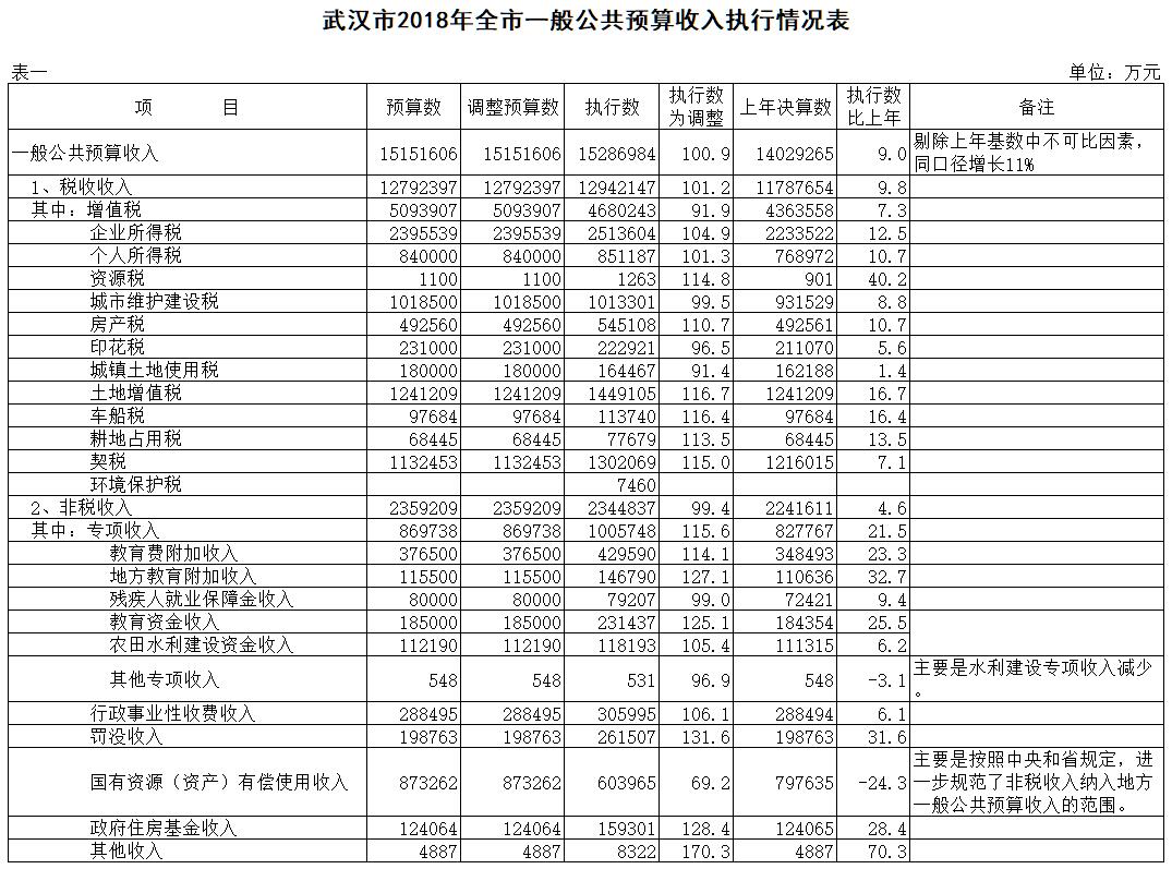 表1:武汉市2018年全市一般公共预算收入执行情况表