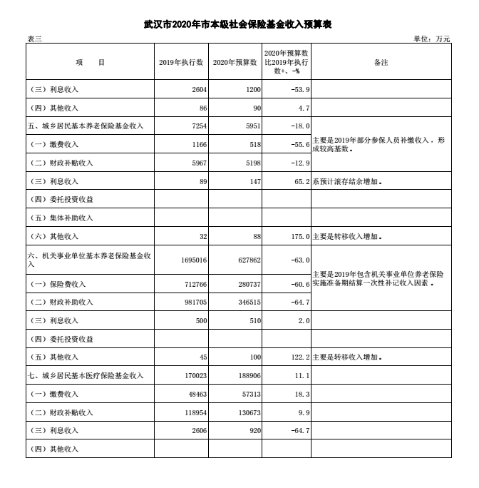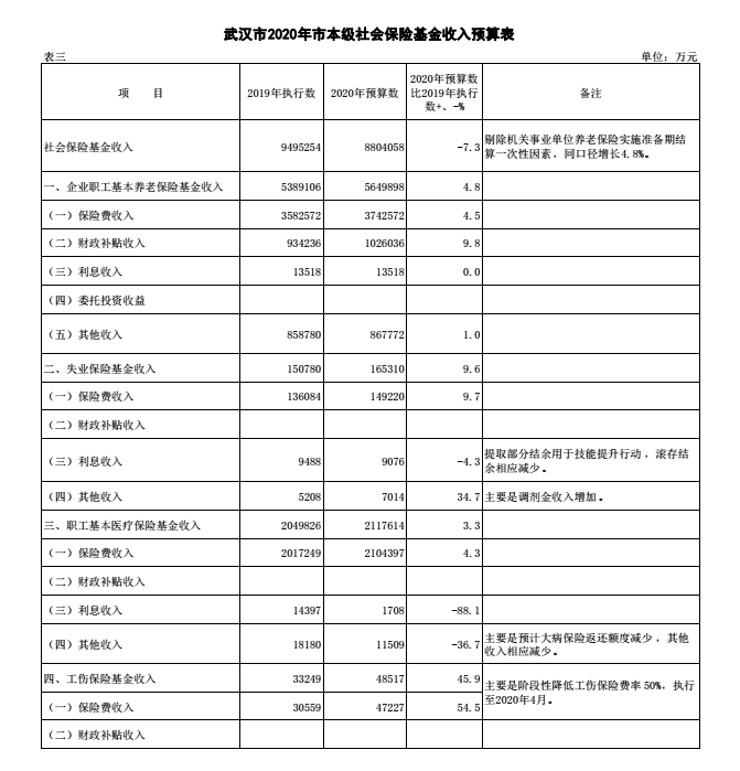 表三 武汉市2020年市本级社会保险基金收入预算表