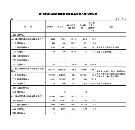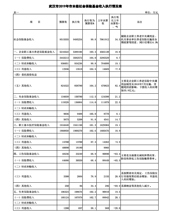 表一 武汉市2019年市本级社会保险基金收入执行情况表