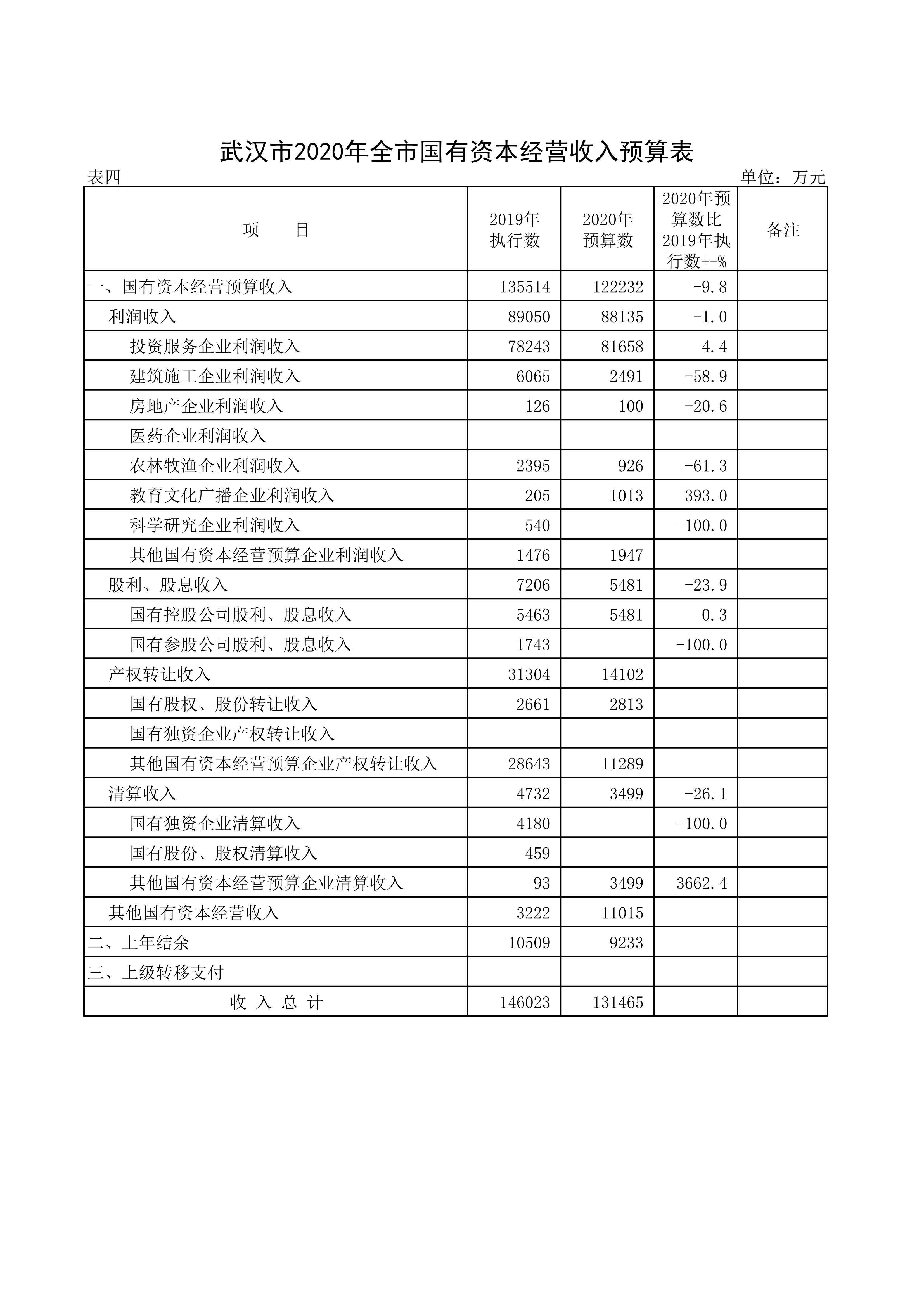 表四 武汉市2020年全市国有资本经营收入预算表