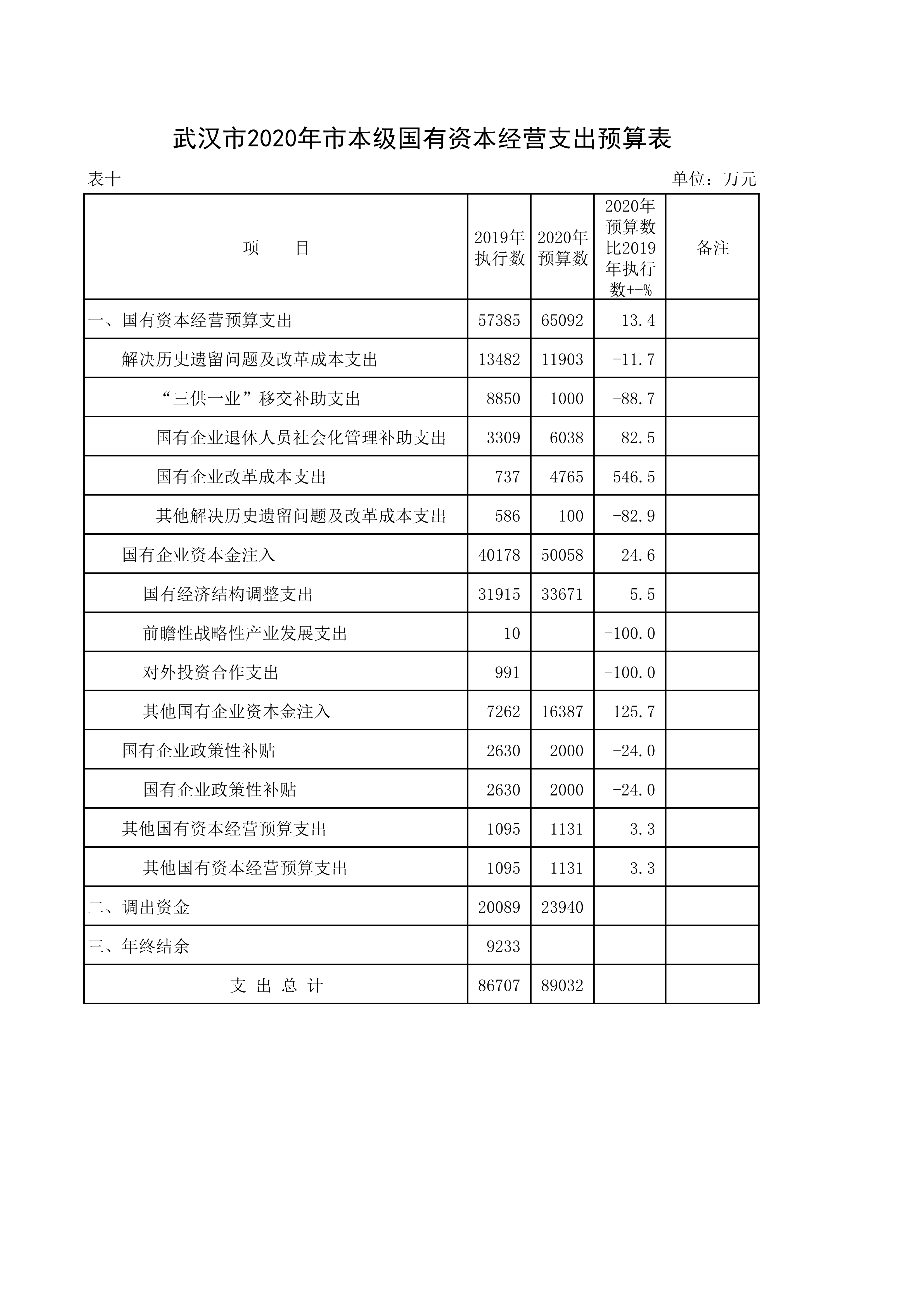 表十 武汉市2020年市本级国有资本经营支出预算表