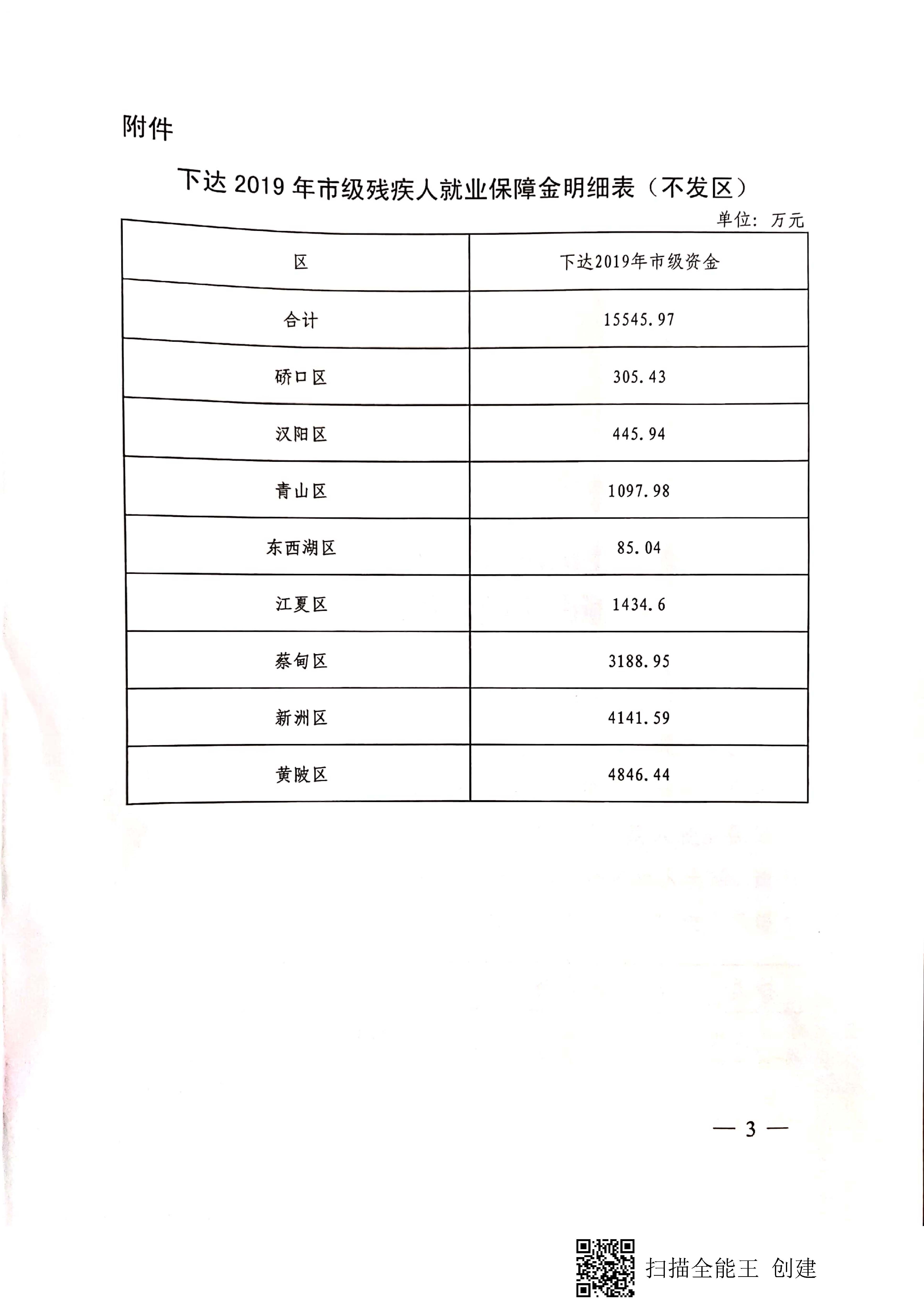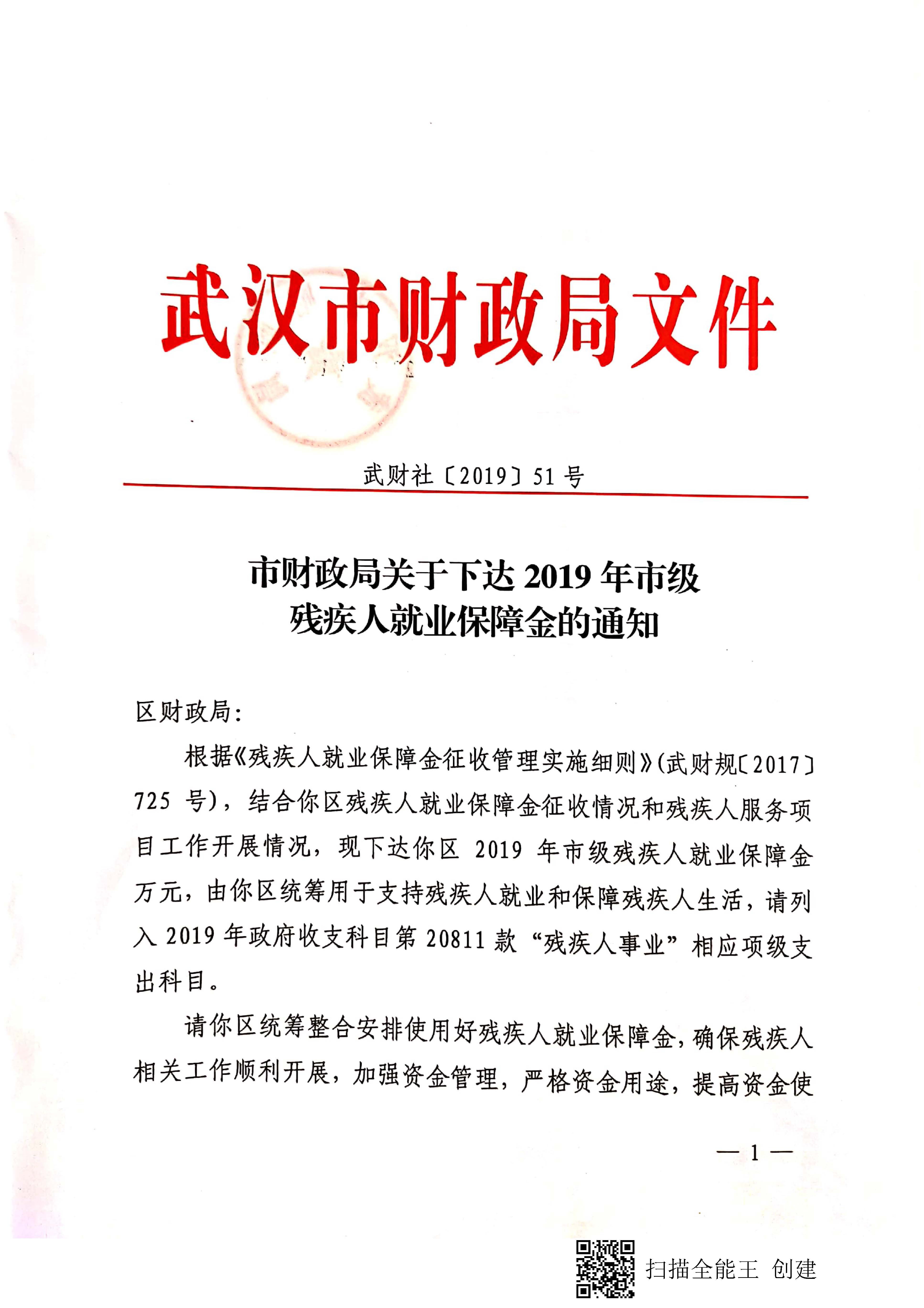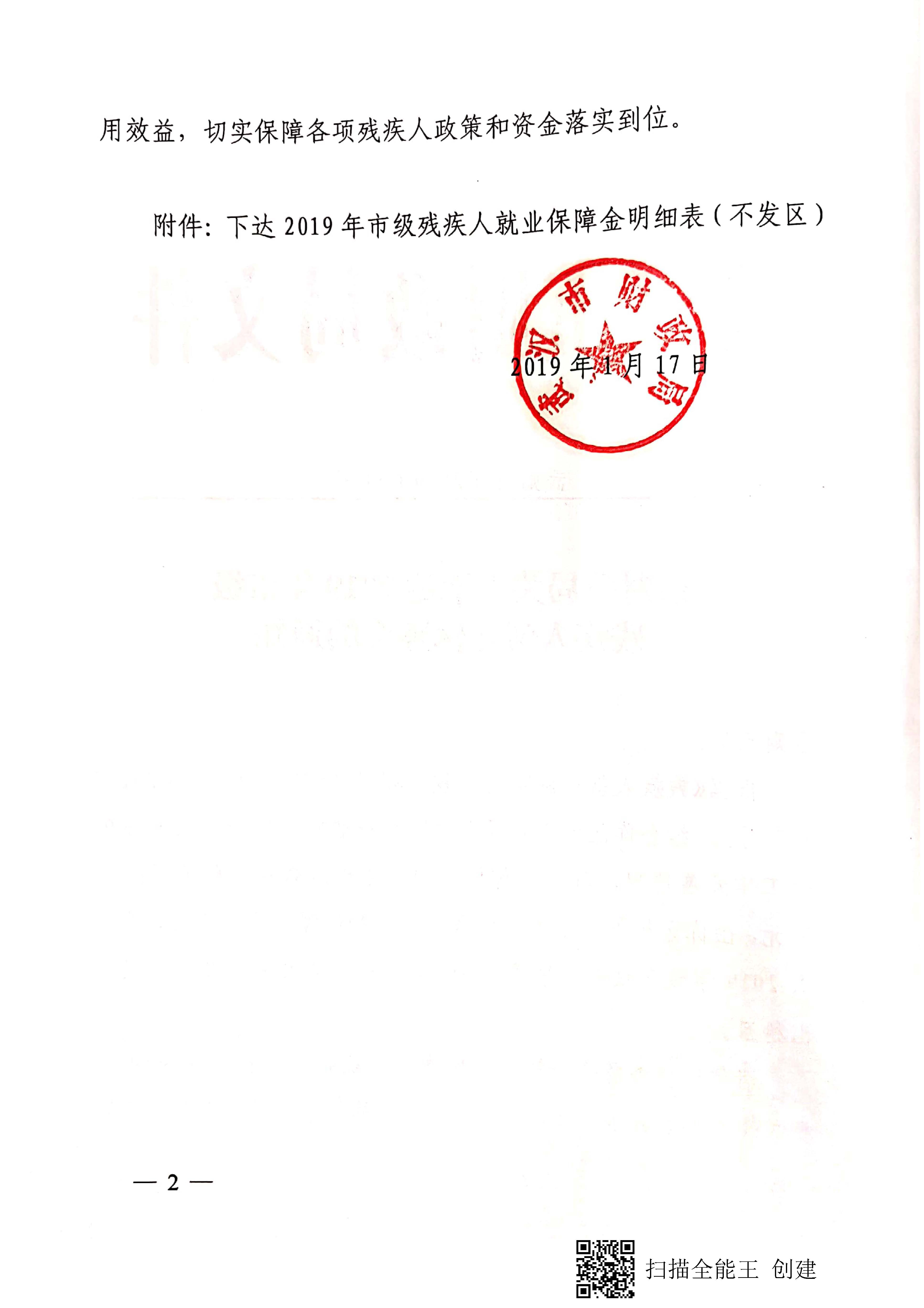 关于下达2019年市级残疾人就业保障金的通知