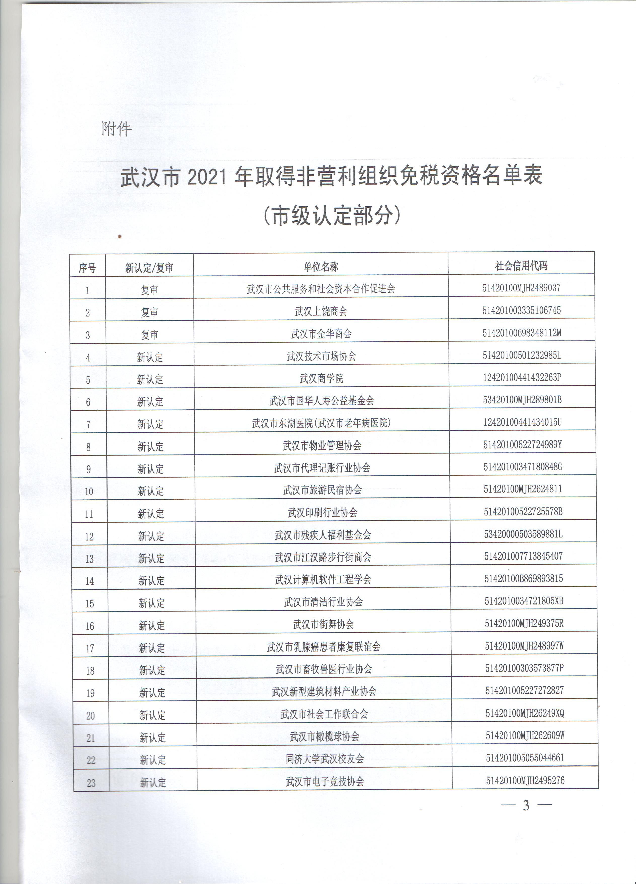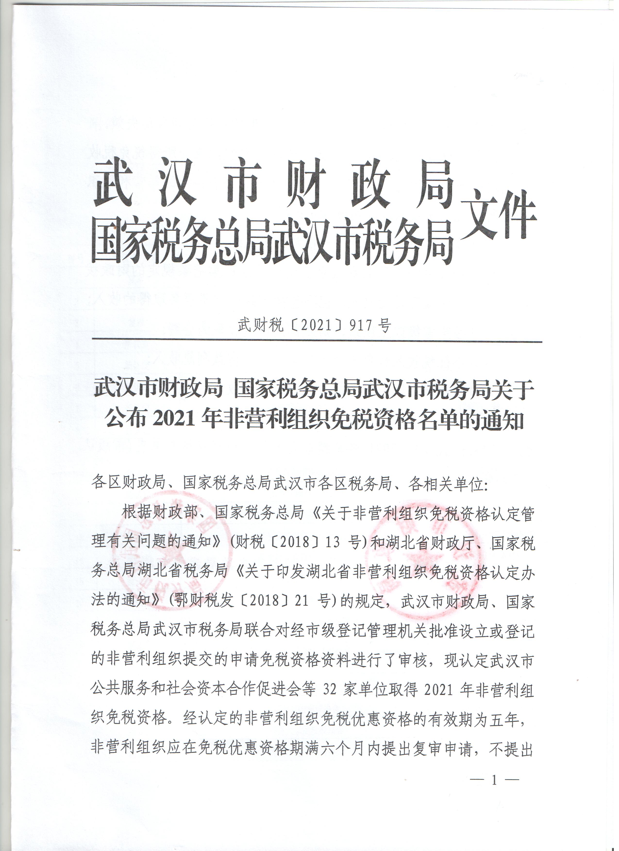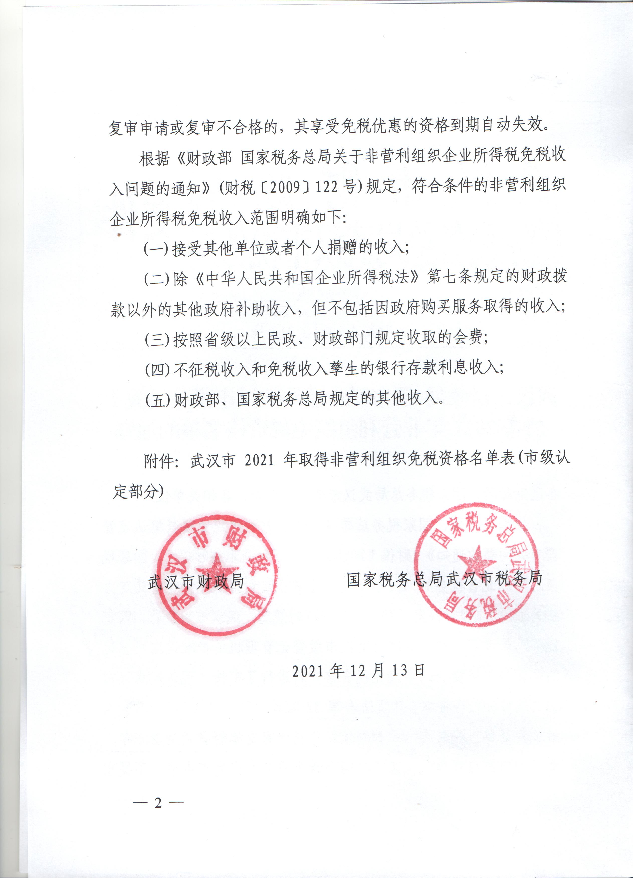 武汉市财政局 国家税务总局武汉市税务局关于公布2021年非营利组织免税资格名单的通知