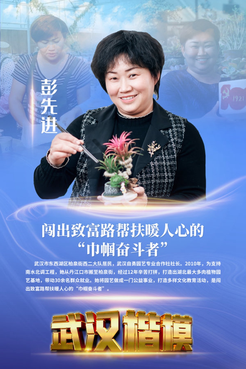 2010年,为支持国家南水北调项目,彭先进从十堰市丹江口市举家搬迁到武汉市东西湖区柏泉街道二大队彭家庄生活。作为一名单亲妈妈,她带着孩子开始创业,拿出开小吃店攒下的3万元建起多肉植物种植大棚,边种植边积累种植经验。经过多年打拼,她打造出武汉市最大、湖北省品种最多的多肉植物园艺基地,带动了当地移民就业。