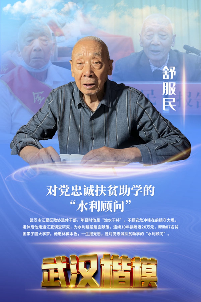 青年时期,舒服民是“治水干将”,不顾个人安危冲锋在前守大堤。退休后,他带领退休老水利工程技术人员,不顾年老体弱、高温晴热,历时近两个月走访江夏区乌龙泉、法泗等8个街道(乡镇)的长江干堤、阳武干渠,以及部分民堤民垸、水库、涵闸、塘堰、灌排泵站等水利工程,拟定工作建议,为区委、区政府科学决策提供了重要参考依据。