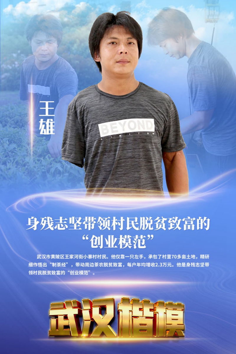 王雄12岁时意外失去右臂,用左手学会吃饭、穿衣、写字,走进课堂,走入社会。依托精准扶贫政策,加上自身努力奋斗,他承包茶园,面积扩大到70亩,打造了“木兰红”品牌无公害茶园。2016年,他在当地率先加工生产“木兰红”系列红茶,当年获利2万余元并率先脱贫。