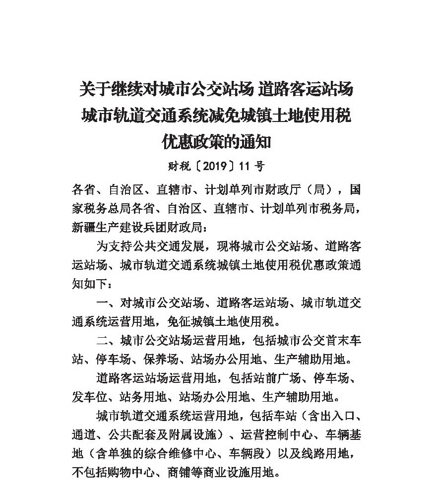 关于继续对城市公交站场 道路客运站场 城市轨道交通系统减免城镇土地使用税优惠政策的通知