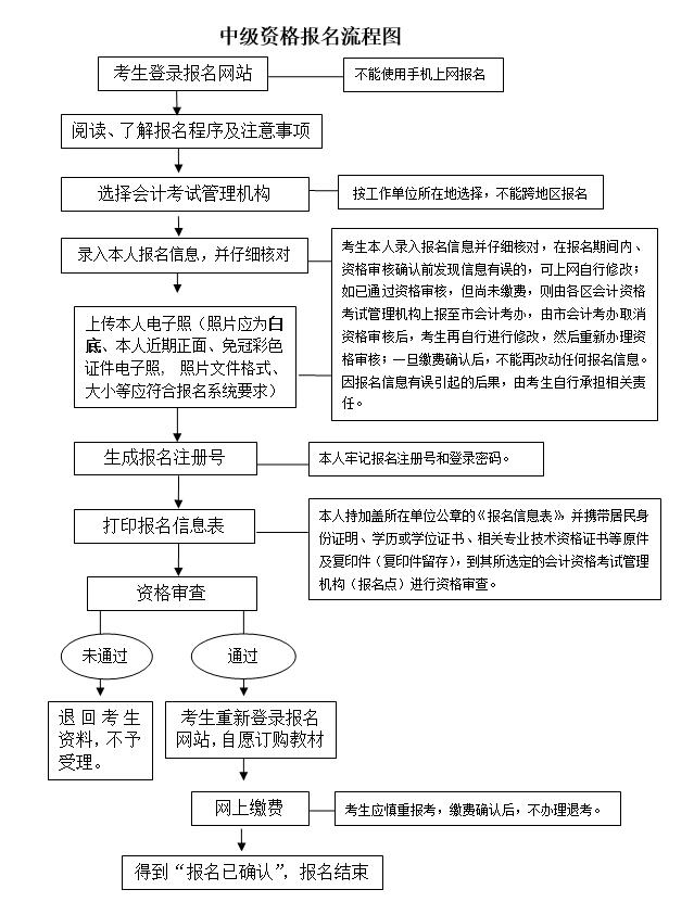 初级资格考试实行网上报名、网上缴费、报考资格后审;中级资格考试实行网上报名、资格现场审核、网上缴费。报名网址为:“全国会计资格评价网”(网址:http://kzp.mof.gov.cn)。