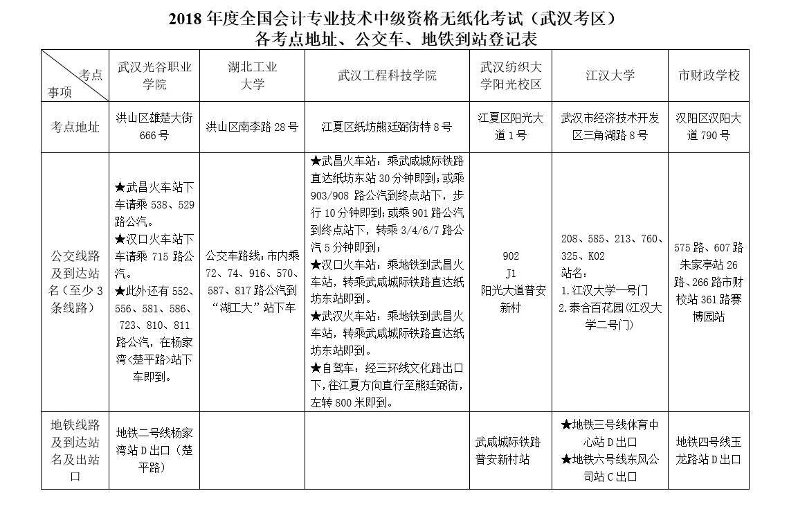 2018年度会计中级资格考试各考点地址