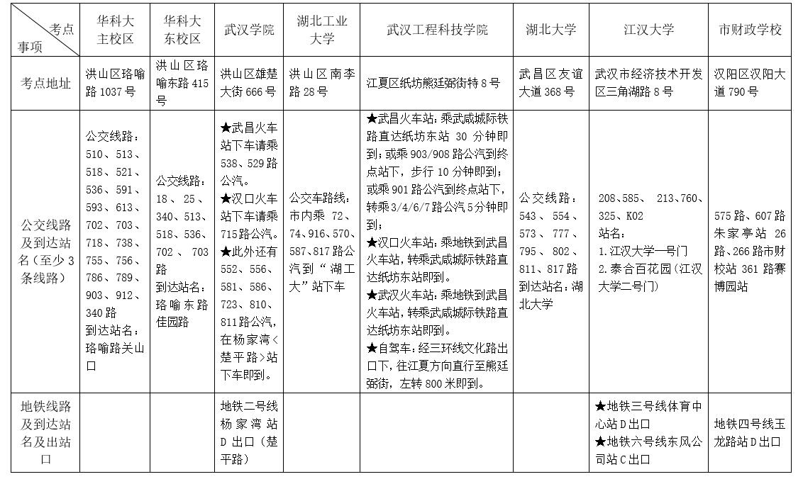 2017年度全国会计专业技术中级资格无纸化考试(武汉考区)各考点地址、公交车、地铁到站登记表