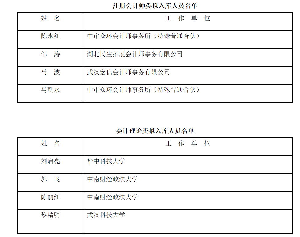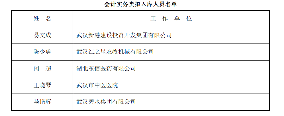 为落实人才强市战略,加强我市会计人才队伍建设,着力培养高层次会计人才,贯彻执行《武汉市高级人才库建设实施方案》。按照“公开、平等、竞争、择优”的原则,经过本人申报、专家评审、组织确认,并报武汉市高级会计人才队伍建设领导小组同意,现对拟入选的高级会计人才进行公示(详见附件)。