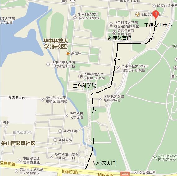 2.从珞喻东路佳园路公交车站步行至华中科技大学东校区大门,从大门至工程实训中心A座路线如下: