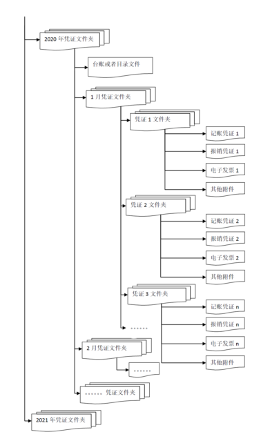 无电子档案管理系统的单位,如实施了会计信息系统,与电子发票相关的记账凭证、报销凭证等已全部实现电子化,可将电子发票与相关的记账凭证、报销凭证等移交会计档案管理人员保存,编制档号,存储结构建议采取下图所示方式: