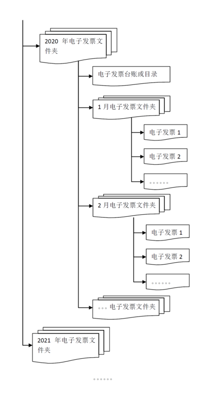 如未实施会计信息系统,与电子发票相关的记账凭证、报销凭证未实现电子化,电子发票以电子形式移交会计档案管理人员保存,存储结构建议采取下图所示方式: