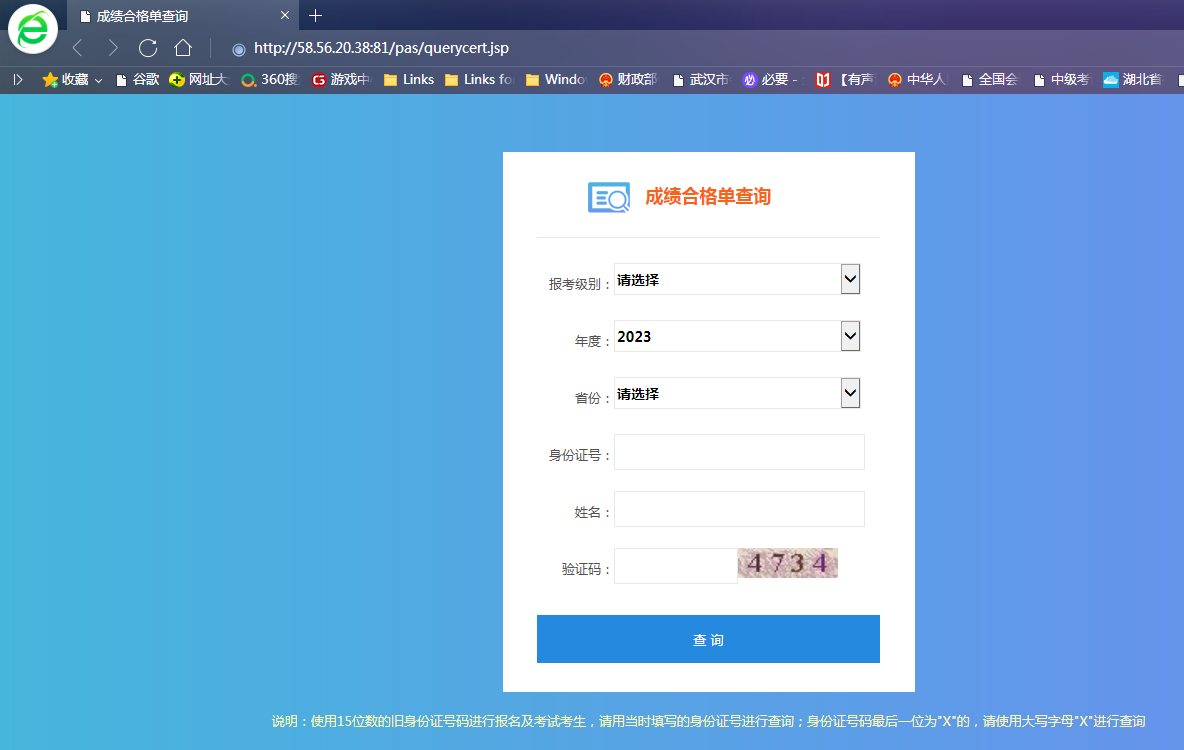 第四步:按要求分别输入“报考级别”、“年度”、“省份”、“身份证号”、“姓名”和“验证码”后,点击“查询”。